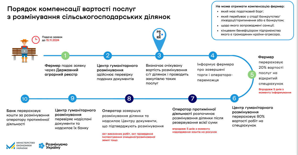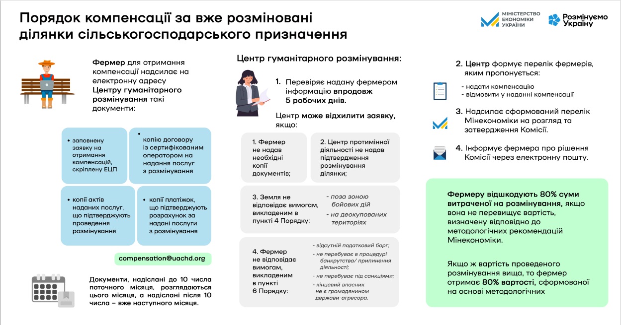 Відповідно до листа Міністерства економіки України від 03.06.2024 № 2601-11/40200-06, інформуємо, що постановою Кабінету Міністрів України від 12 березня 2024 року № 284 (зі змінами) затверджено Порядок використання коштів, передбачених у державному бюджеті для здійснення компенсації витрат за гуманітарне розмінування земель сільськогосподарського призначення.